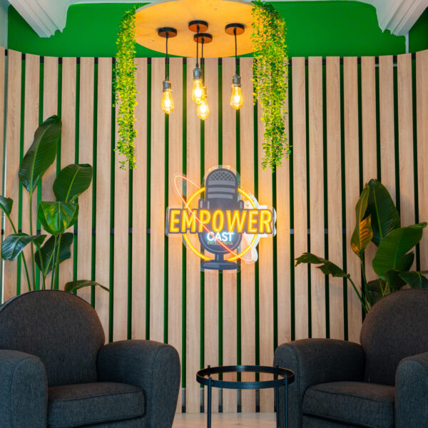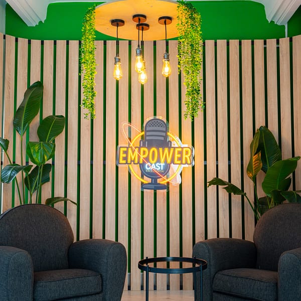 Studio podcast entièrement équipé pour des enregistrements professionnels. Microphones de qualité et environnement optimal pour capturer un son clair – parfait pour créateurs de contenu et coaches dans un coworking à Tunis.