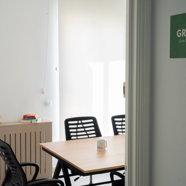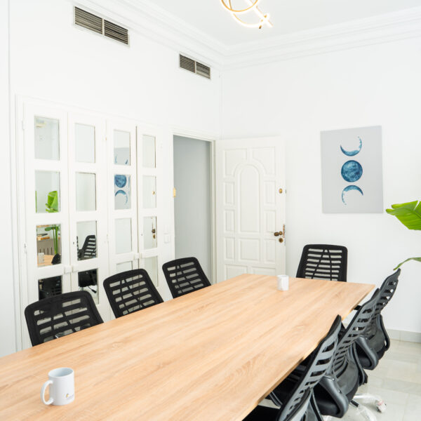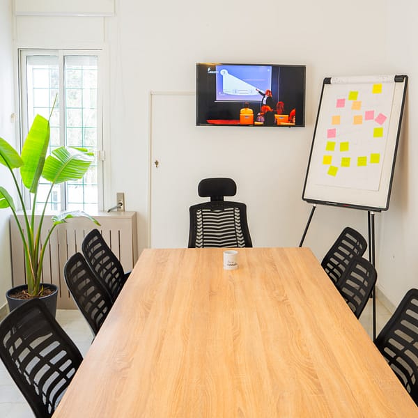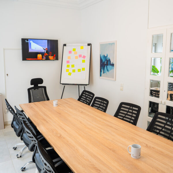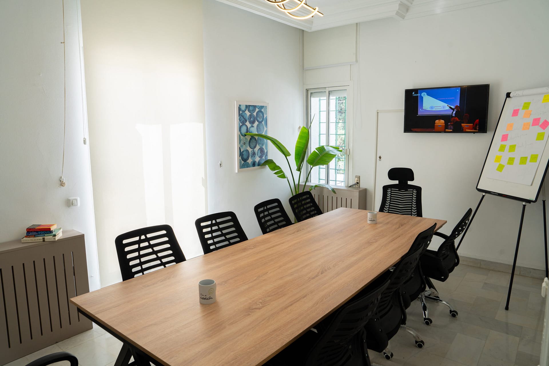 Salle de réunion moderne équipée pour meetings, brainstormings et formations. Idéale pour équipes, coaches et entrepreneurs qui ont besoin d’un espace calme et professionnel dans leur coworking à Tunis.